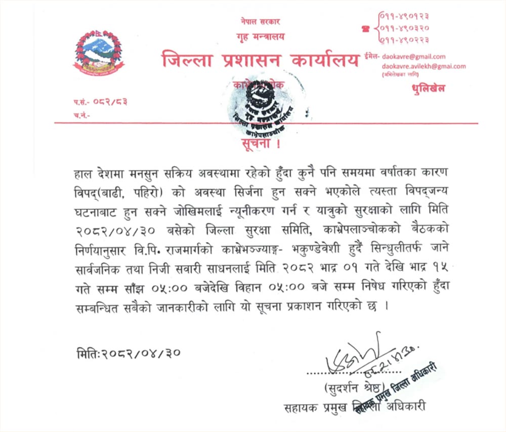 बनेपा । जिल्ला प्रशासन कार्यालय काभ्रेले रातको समयमा बिपी राजमार्गको काभ्रे भन्ज्याङदेखि सिन्धुलीतर्फ जाने सार्वजनिक तथा निजी सवारी साधन रोक लगाउने निर्णय गरेको छ ।