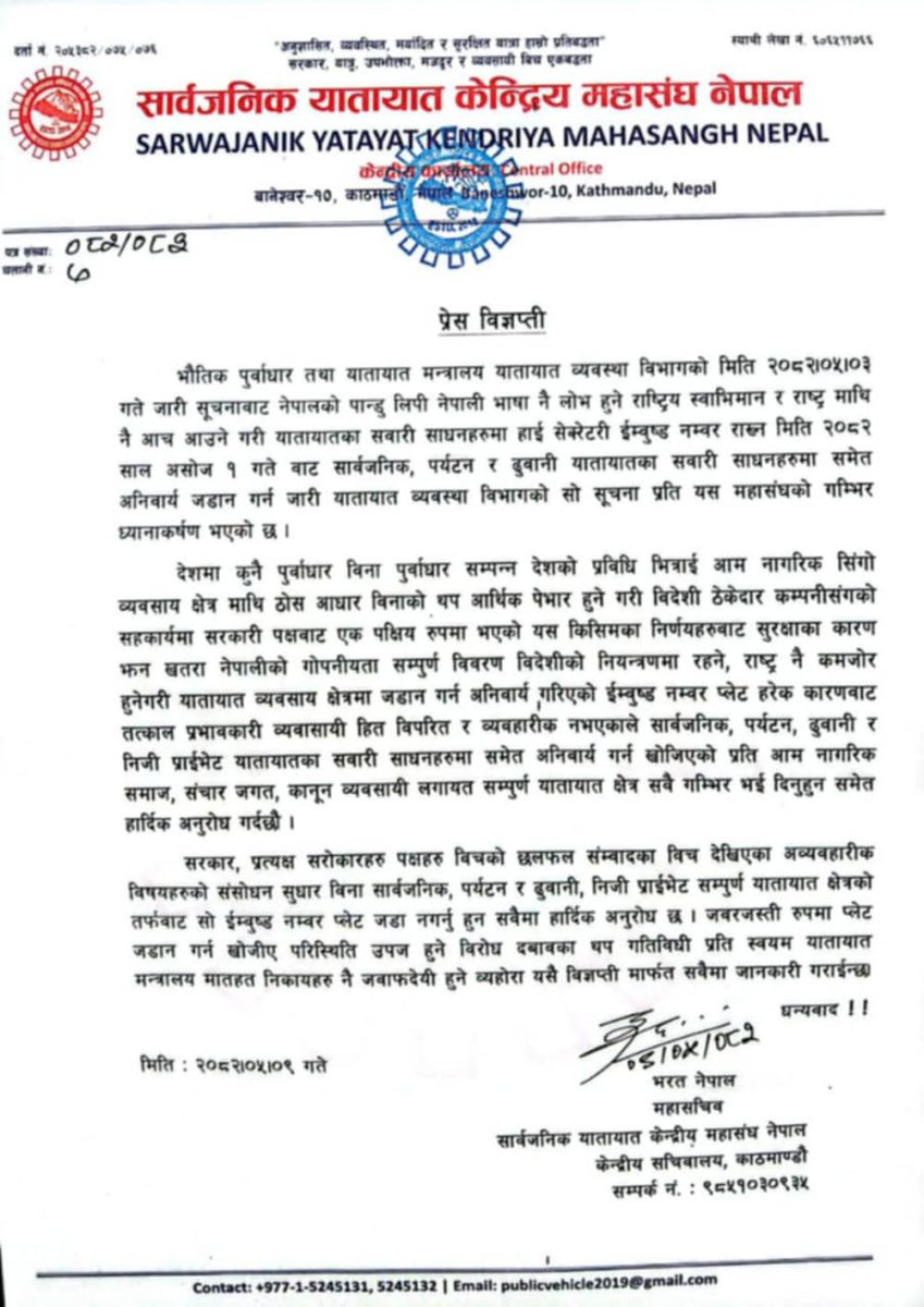 यातायात व्यवसाय क्षेत्रमा जडान गर्न अनिवार्य गरिएको इम्बोस्ड नम्बर प्लेट हरेक कोणबाट तत्काल व्यवासायीको हित विपरित र व्यवहारिक नभएको भन्दै सार्वजनिक, पर्यटन, ढुवानी र निजी नम्बर प्लेटका सवारी साधनहरुमा समेत अनिवार्य गर्न खोजिएको निर्णय प्रति गम्भिर हुन यातायत व्यवासायीले नागरिक समाज, सञ्चार, कानून व्यवसायी तथा सबै यातायात क्षेत्रलाई अनुरोध गरेका छन् ।