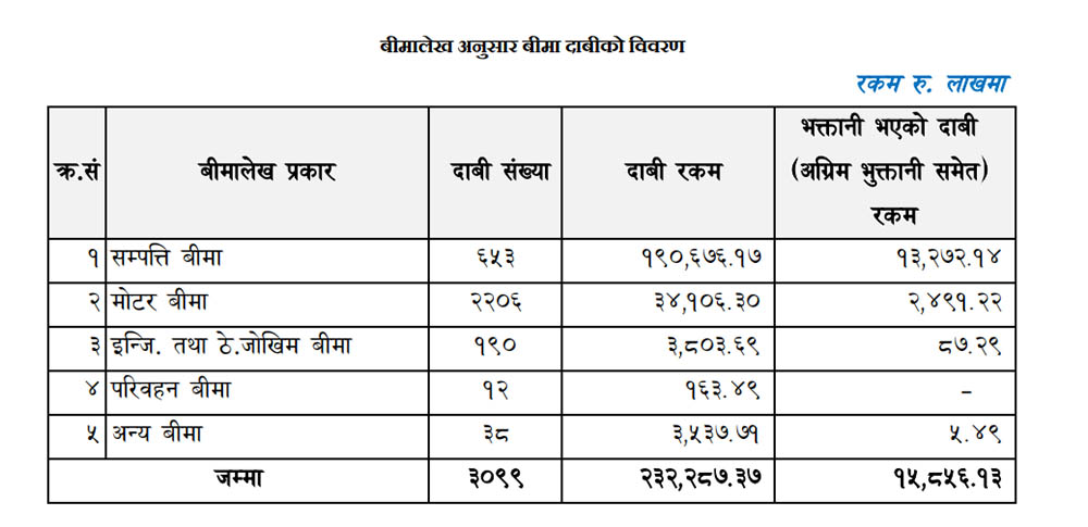 २३ असोजसम्म भएको दाबी भुक्तानीमध्ये सबैभन्दा बढी १ अर्ब ३२ करोड ७२ लाख सम्पत्ति बीमा (घरसम्पत्ति) अन्तर्गतको रहेको छ । सम्पत्ति बीमामा सबैभन्दा बढी १९ अर्ब ६ करोड ७६ लाख दाबि परेको छ ।  त्यस्तै मोटर बीमामा ३ अर्ब ४१ करोड ६ लाख दाबि परेकोमा २४ करोड ९१ लाख मात्र अहिलेसम्म भुक्तानी भएकोछ ।