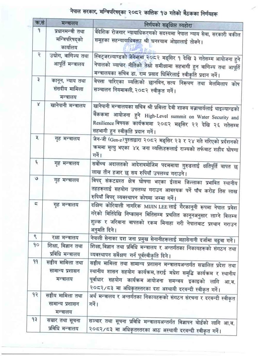काठमाडौँ । कार्तिक १३ गते बसेको मन्त्रिपरिषद्को बैठकका निर्णयहरु सार्बजनिक गरिएको छ ।