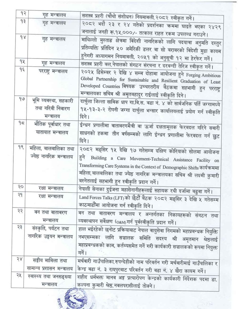 सम्बन्धित खबर सम्पूर्ण मन्त्रिपरिषद्को बैठकका १४ निर्णय सार्बजनिक मन्त्रिपरिषद्को बैठकले के के निर्णय गर्यो ? मुख्यसचिवमा सुमनराज अर्याल नियुक्त मन्त्रिपरिषदको बैठक बस्दै, मुख्यसचिव नियुक्त हुनसक्ने मन्त्रिपरिषद्को बैठकले के के निर्णय गर्यो ? जेनजी आन्दोलनका घाइतेलाई तत्काल जनही १५ हजार दिने सरकारको निर्णय