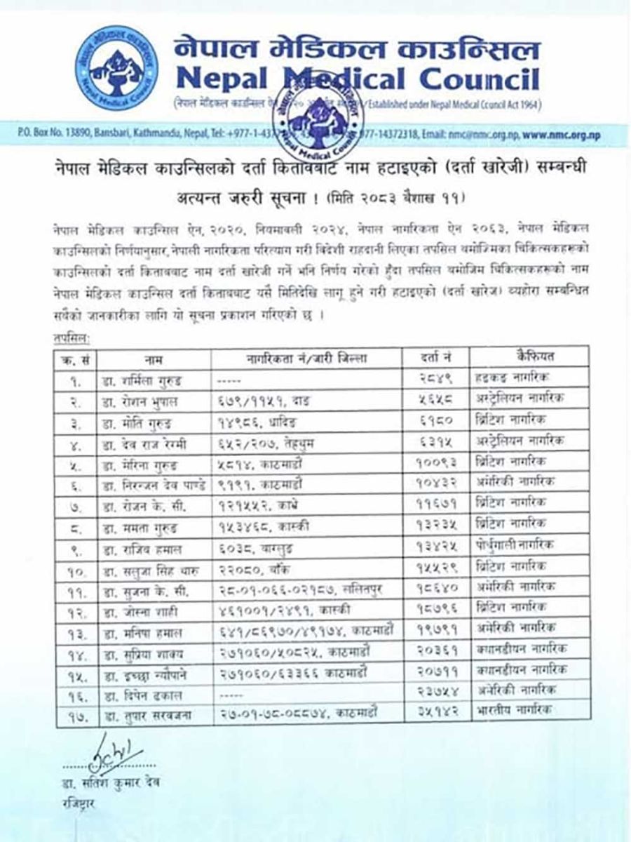 शुक्रबार काउन्सिलले नेपाली नागरिकता त्यागी विदेशी नागरिकता लिएका १७ जना डाक्टरको नाम नेपाल मेडिकल काउन्सिलको दर्ता कितावबाट खारेज गरेको जानकारी गराएको छ ।