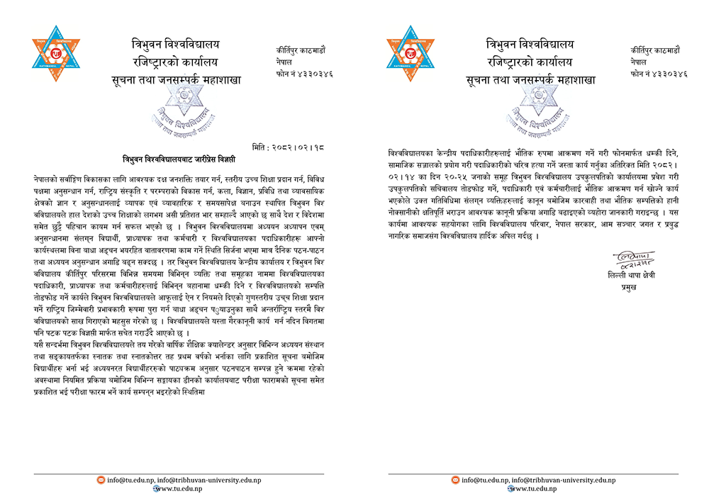 सूचना तथा जनसम्पर्क महाशाखा प्रमुख लिल्ली थापा क्षेत्रीले जारी गरेको विज्ञप्तिमा त्रिभुवन विश्वविद्यालयका केन्द्रीय पदाधिकारीहरूलाई भौतिक रूपमा आक्रमण गर्ने गरी फोनमार्फत धम्की दिने, सामाजिक सञ्जालको प्रयोग गरी पदाधिकारीको चरित्र हत्या गर्ने जस्ता कार्य गर्नुका साथै सो दिन २०-२५ जनाको समूहले उपकुलपतिको कार्यालयमा प्रवेश गरी सचिवालय तोडफोड गर्ने, पदाधिकारी एवं कर्मचारीलाई भौतिक आक्रमण गर्न खोज्ने भएको भन्दै सो गतिविधिमा संलग्न व्यक्तिहरुलाई कानुन बमोजिमको कारवाही अगाडी बढाइएको बताएका छन् ।