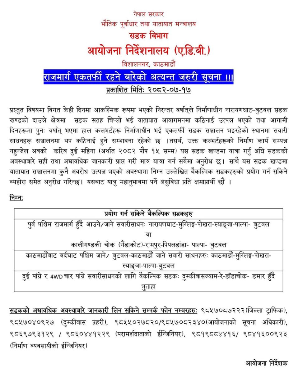 आयोजनाले विगत केही दिनमा आकस्मिक रूपमा भएको निरन्तर वर्षातले निर्माणाधीन नारायणघाट-बुटवल सडक खण्डको दाउन्ने क्षेत्रमा सडक सतह चिप्लो भई यातायात आवागमनमा कठिनाई उत्पन्न भएको तथा आगामी दिनहरूमा पुनः वर्षात् भएमा हाल कलभर्टहरू निर्माणाधीन भई एकतर्फी सडक सञ्चालन भइरहेको स्थानमा सवारी साधनहरू सञ्चालनमा थप कठिनाई हुने सम्भावना रहेको बताएको छ ।