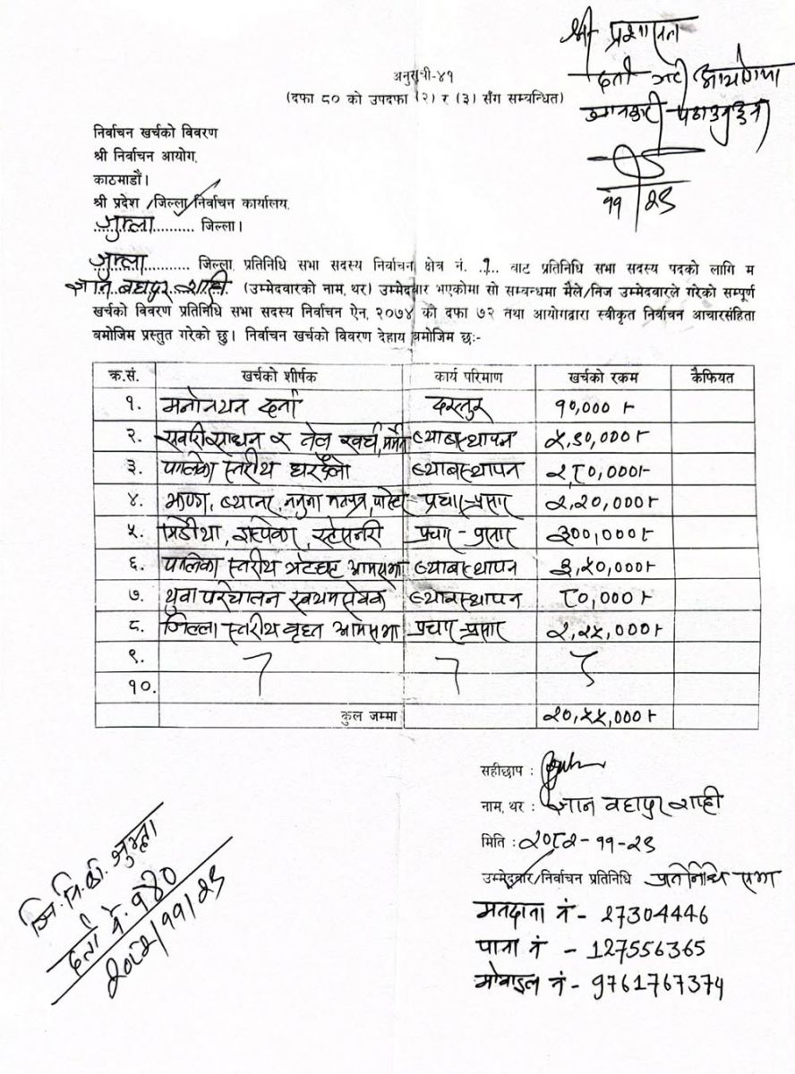 काठमाडौं । जुम्लाबाट प्रतिनिधिसभामा निर्वाचित राप्रपाका प्रवक्ता ज्ञानेन्द्र शाहीले आफ्नो चुनावी खर्च विवरण सार्वजनिक गरेका छन् ।